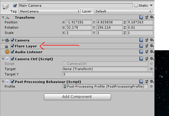 2. 메인 카메라에 Flare Layer 컴포넌트를 추가해줍니다. (이 컴포넌트는 건드릴 게 없음.)