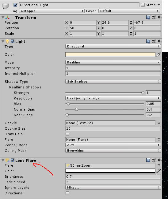 1. 사용하고 싶은 Light에 LensFlare 컴포넌트를 추가해줍니다.