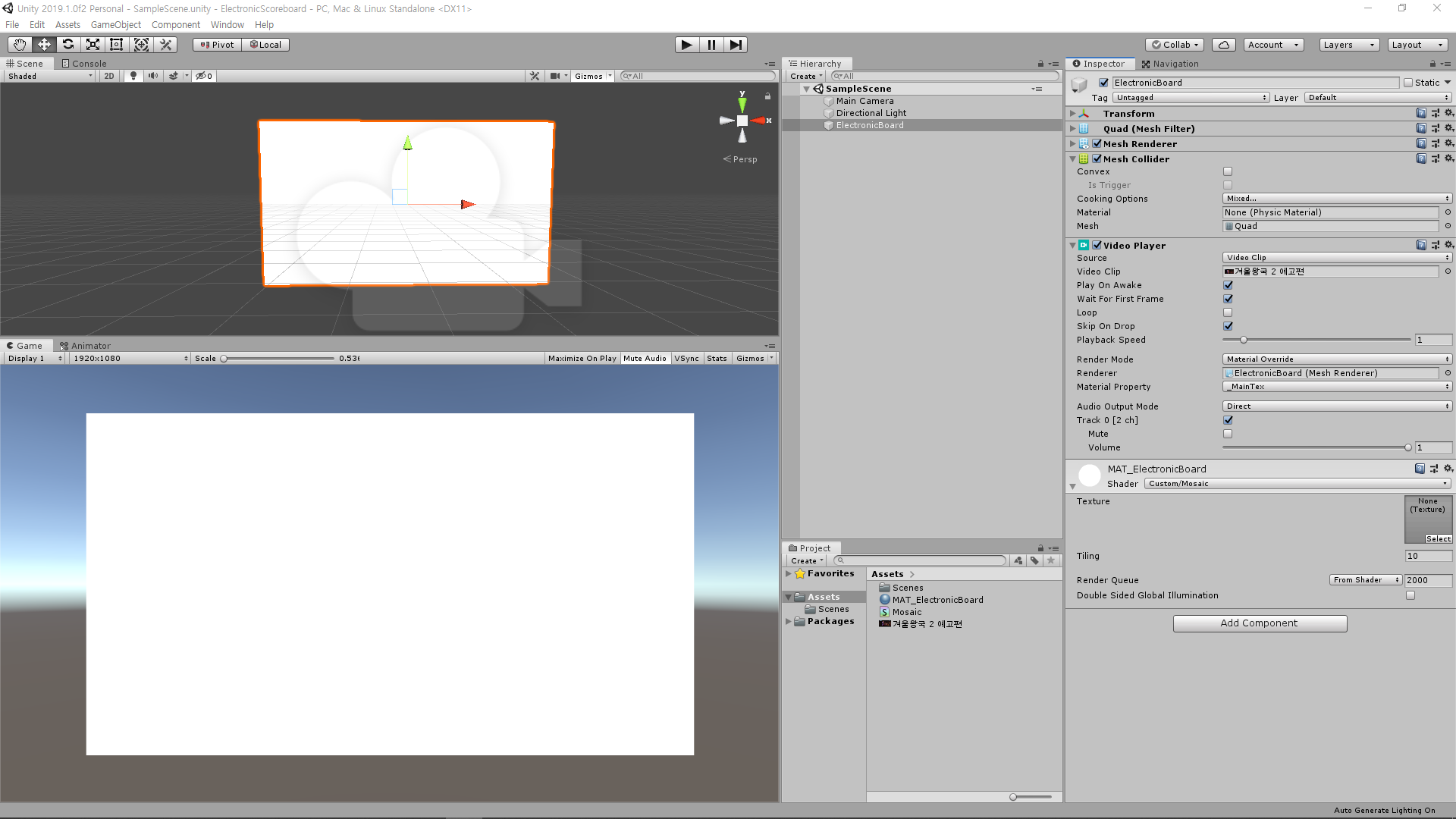 1. Quad 오브젝트 추가 (영상 크기에 맞게 늘려줌.)