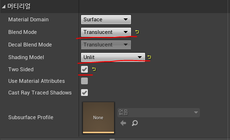 투명하게 만드려면 Material의 디테일 패널에서 설정을 바꾸어주어야 한다.