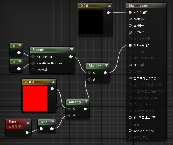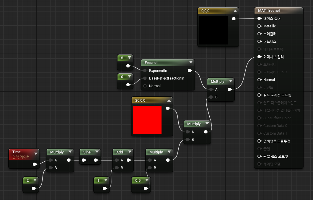 뭔가 더 추가해볼 건 없을까 하다가, Time 노드와 Sin 노드를 이용해서 가지고 놀아보았다.