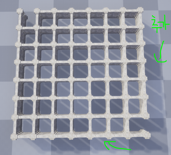 동쪽 벽과 남쪽 벽을 안보이게 하고, 원래처럼 배치한다. 이후에 가장 동쪽 벽과 남쪽 벽들만 한번 더 보이도록 변경한다.