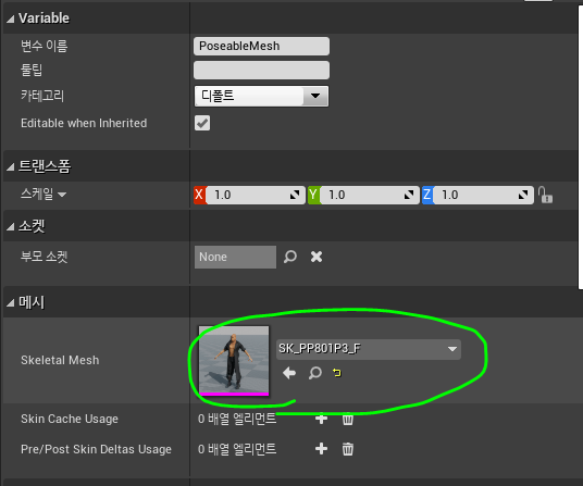2. 컴포넌트에 PoseableMesh를 추가하고, 설정 값을 바꾼다.