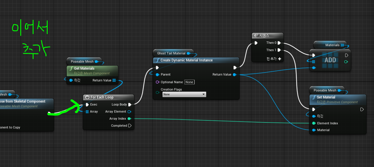6번의 머터리얼 세팅이 끝나면 투명화를 시키는 타임라인 노드를 실행시켜준다.
