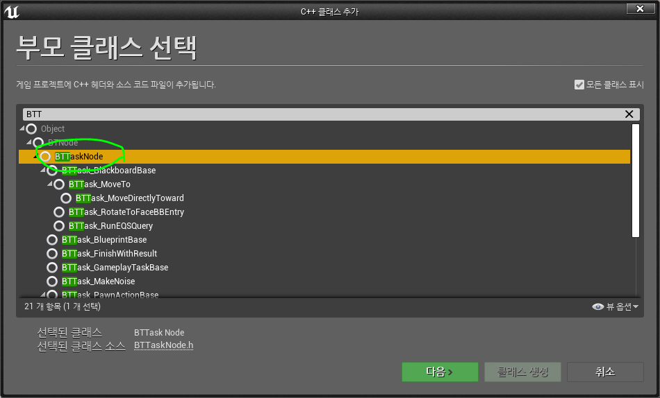 BTTaskNode를 부모 클래스로 하는 클래스를 생성한다.