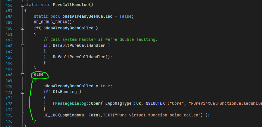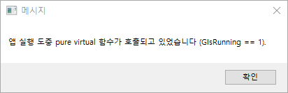 FMessageDialog::Open( EAppMsgType::Ok, NSLOCTEXT("Core", "PureVirtualFunctionCalledWhileRunningApp", "Pure virtual function being called while application was running (GIsRunning == 1).") );