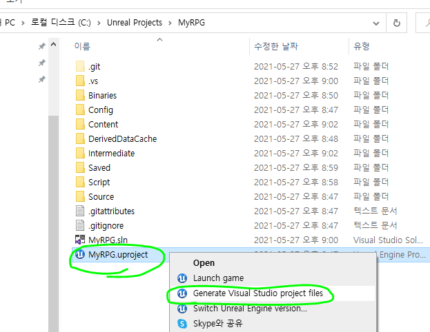 (.vs, Binaries, Intermediate 폴더, Sln 파일)을 지우고 다시 .sln파일을 만들어준다.