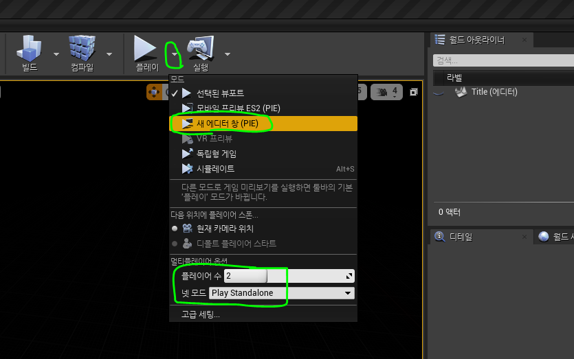 Title 레벨에서는 아직 서버에 연동되어있지 않기에, Play Standalone으로 설정해야한다.
