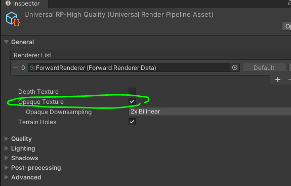 Opaque Texture 설정은 불투명 오브젝트를 다 그린 다음, 그 화면을 Texture로 저장해놓겠다는 의미이다.