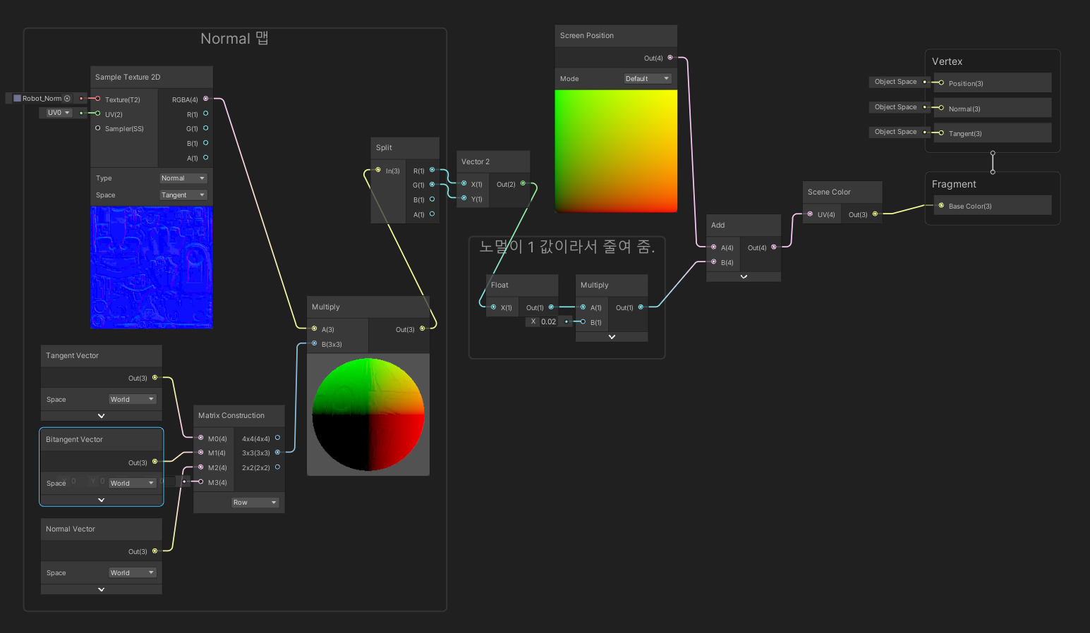 Lit Shader에서는 Normal Map 넣는 곳에 그냥 이어주기만 하면 알아서 계산해주지만, Unlit Shader에서는 직접 계산해줘야 한다.