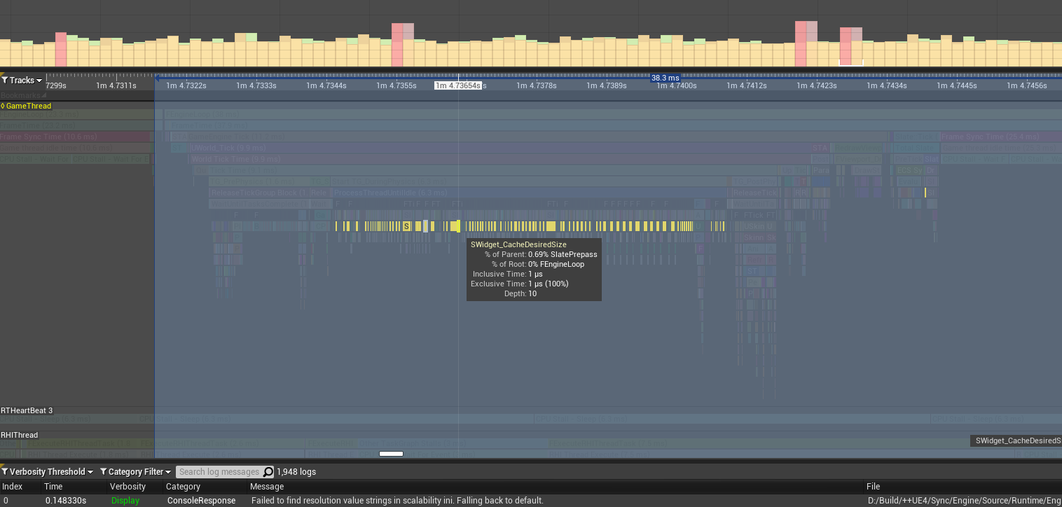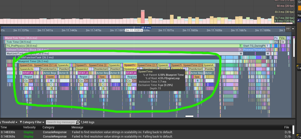 프레임 막대 중에서 시간이 오래 걸린 막대를 선택해보면 증상을 알 수 있다. 막대가 아래 쪽으로 갈수록 자세히 볼 수 있다. 아래 이미지에서는 Spawn Actor가 엄청나게 많이 잡아먹고 있는 걸 볼 수 있다. 막대 중에 CPU Stall은 무시해도 된다고 한다.