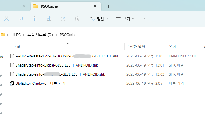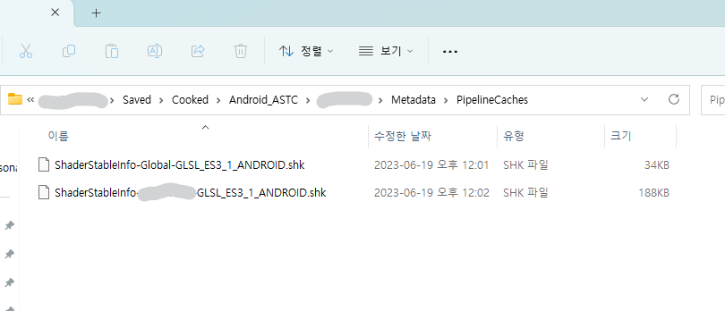 플레이하고 나오면, 해당 기기의 UE4Game/프로젝트명/프로젝트명/Saved/CollectedPSOs 폴더에 .upipelinecache 파일이 생성된 것을 확인할 수 있다.